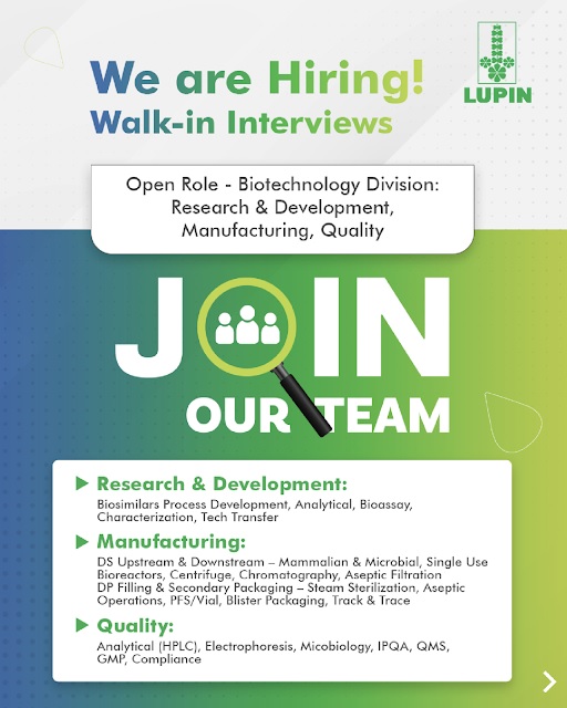 Preference : M.Sc. in Biotechnology / Microbiology / Biochemistry M.Pharm. / B.Pharm. / B.Tech. Diploma in Mechanical / Electrical / Instrumentation