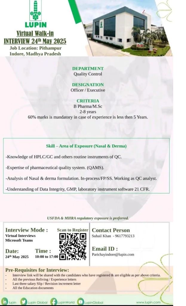 Lupin-Walk in for QC Department – Virtual Interview on 24th May 2025