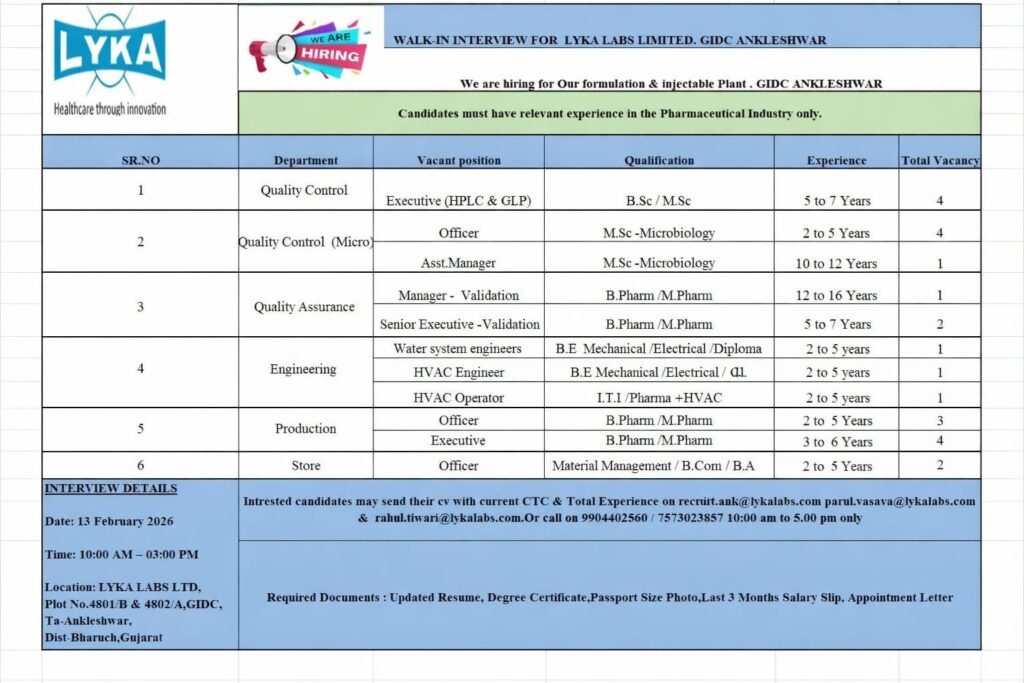Lyka Labs Limited- Walk-In Interview for Formulation and Injectables on 13 February 2026