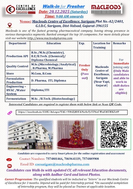 Macleods Pharma- Walk-In Drive for Freshers – Multiple Departments on December 20, 2025 @ (Sarigam, Gujarat)
