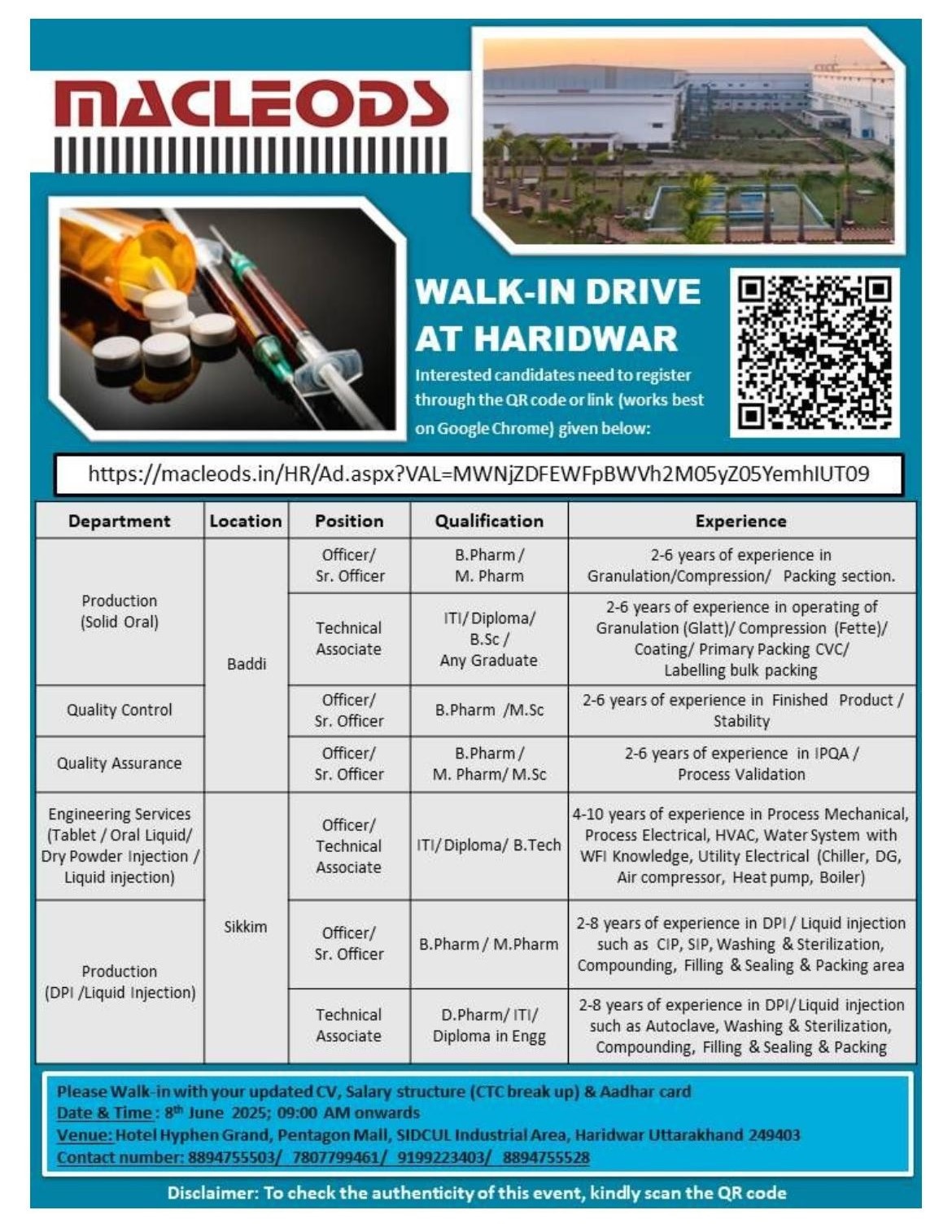 Macleods Pharma -Walk in Drive for M.Pharm, B.Pharm, M.Sc in Production, QC, QA on 8th June 2025