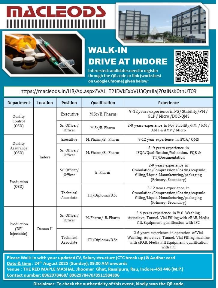 Macleods Pharma- Walk in Drive for M.Pharm, B.Pharm, MSc in Production, QA, QC on 24th August 2025