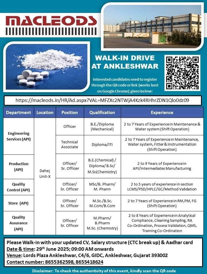 Macleods Pharma- Walk in Interview for Engineering, Production, Quality Control, Quality Assurance, Store on 29th June 2025 @ Dahej