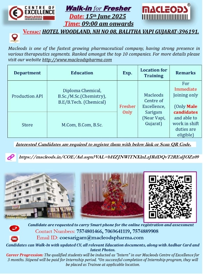 MacLeods Pharma- Walk in Interview for fresher on 15th June 2025 @ Vapi