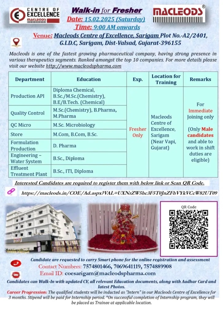 Macleods Pharma-Walk-In for Freshers on 15.02.2025 (Saturday)