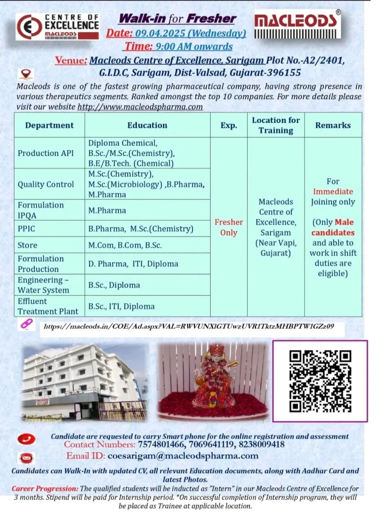 Venue:Macleods Centre of Excellence, Sarigam Plot No.-A2/2401, G.I.D.C, Sarigam, Dist-Valsad, Gujarat-396155
