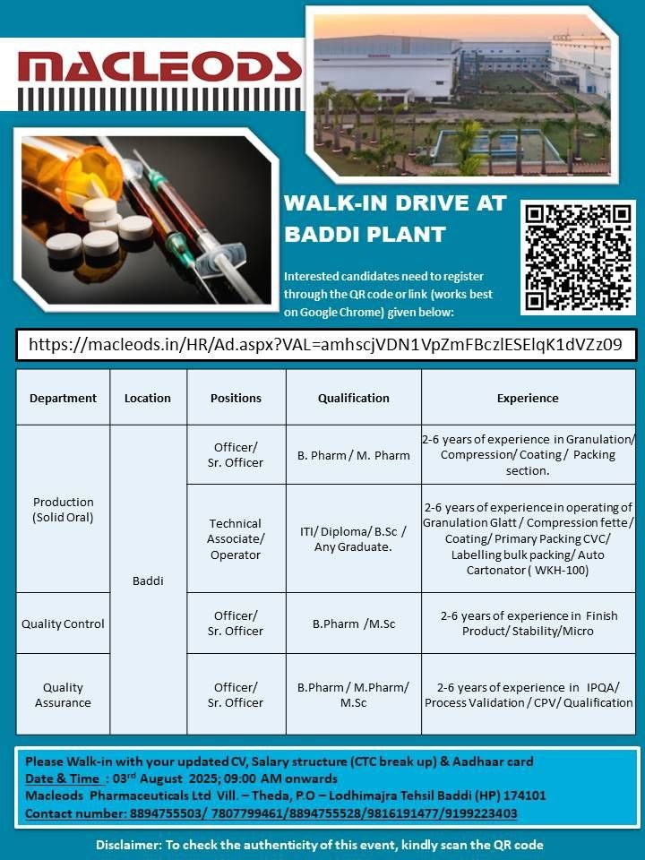 Macleods Pharmaceuticals- Walk-In Interview for Production, QA & QC on 03rd August 2025 @ Baddi