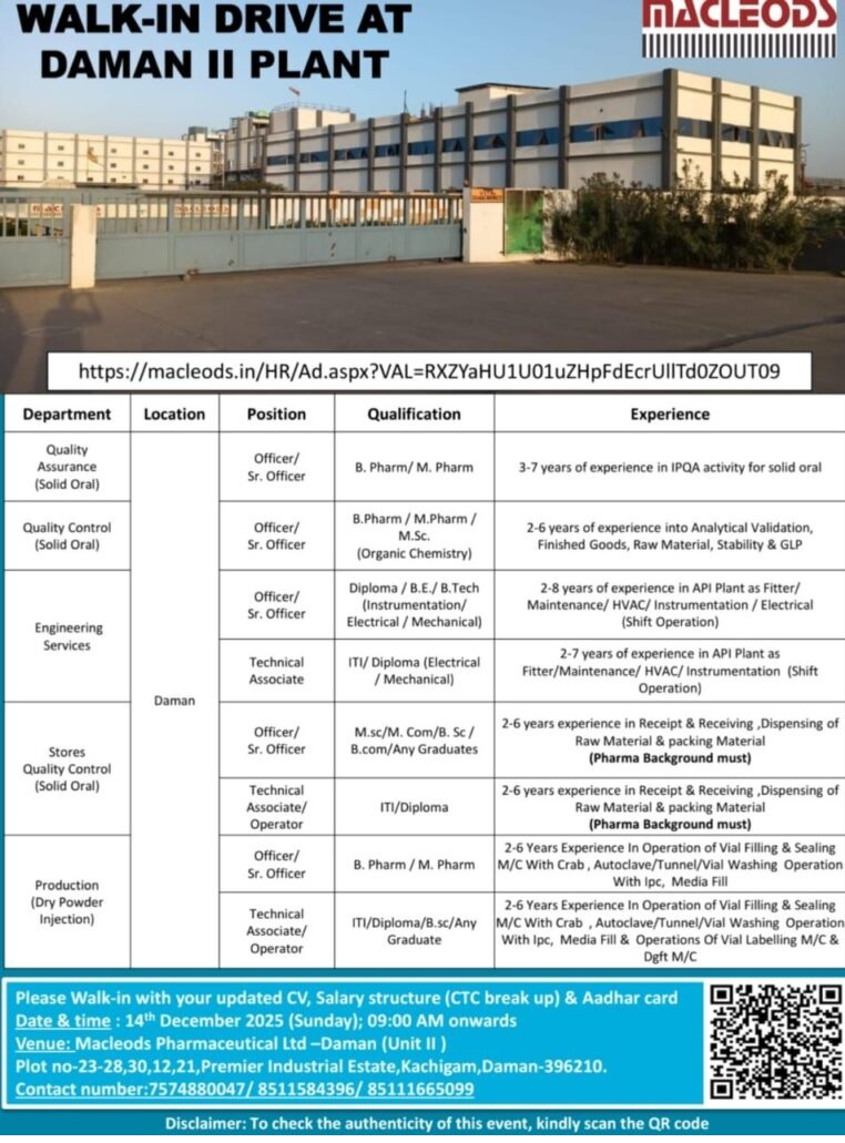Macleods Pharmaceuticals Ltd., one of India’s fastest-growing pharmaceutical companies, is conducting a Walk-In Drive for multiple departments at its Daman Unit II Plant. Passionate and experienced candidates from solid oral, injectable, engineering, and quality functions are invited to join their high-performing team.