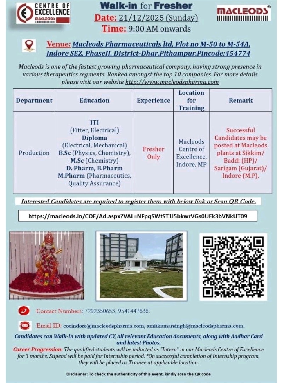 Remark : Successful Candidates may be posted at Macleods plants at Sikkim/ Baddi (HP)/ Sarigam (Gujarat)/ Indore (M.P).