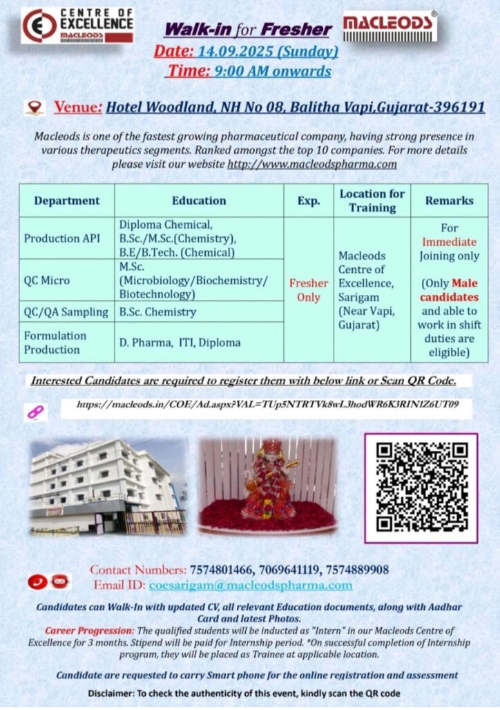 Macleods-Walk in Drive for Fresher D.Pharm, BSc, MSc in Production, QC on 14.09.2025