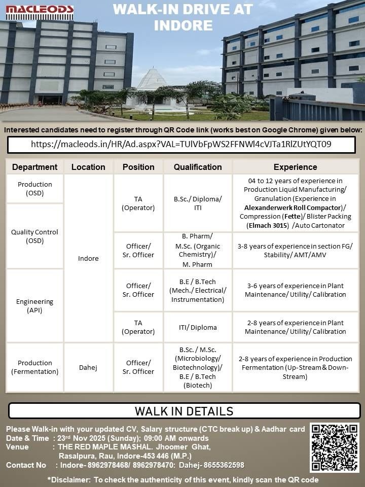 Qualification : B. Pharm/ M.Sc. (Organic Chemistry)/ M.Pharm