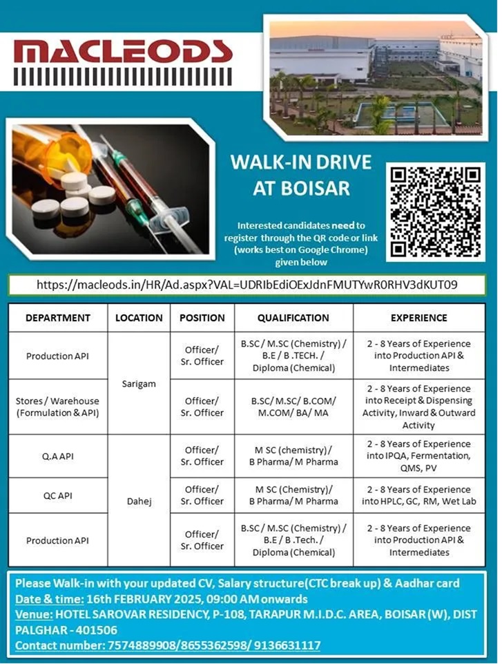 Macleods Pharmaceuticals-Walk In Drive for M.Pharm, B.Pharm, MSc in Production, QA, QC on 16th FEBRUARY 2025