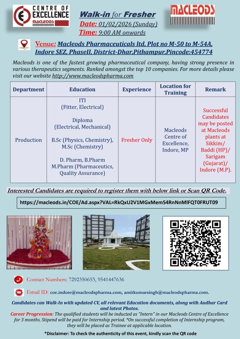 Macleods Pharmaceuticals Ltd., one of the fastest growing pharmaceutical companies in India, is conducting a Walk-In Interview for Freshers at its Centre of Excellence, Indore SEZ. Selected candidates will undergo structured training with potential placement across Macleods manufacturing plants.