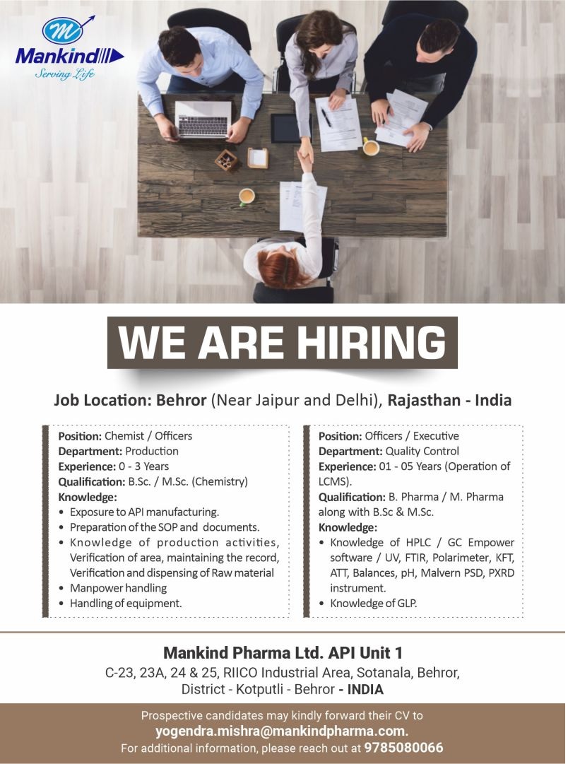 Mankind Pharma-Hiring for MPharm, BPharm, MSc in QC, Production APPLY