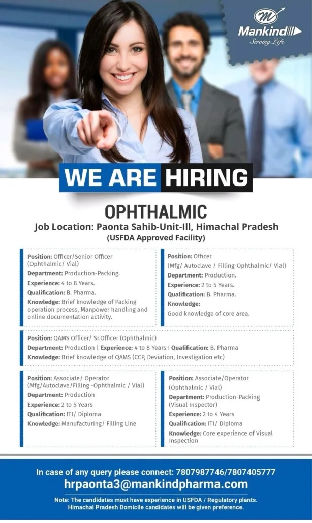 Note : The candidates must have experience in USFDA / Regulatory plants. Himachal Pradesh Domicile candidates will be given preference.