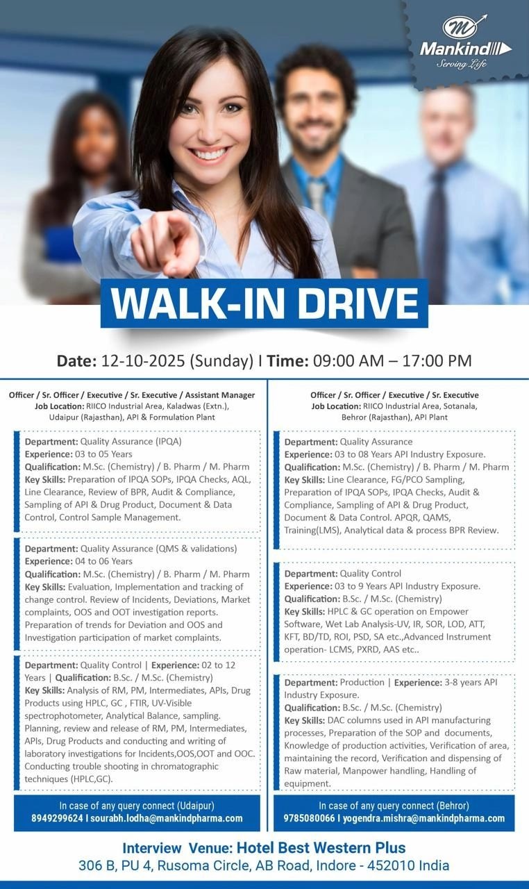 Mankind Pharma -Walk In Interview For QA, QC & Production on 12-10-2025