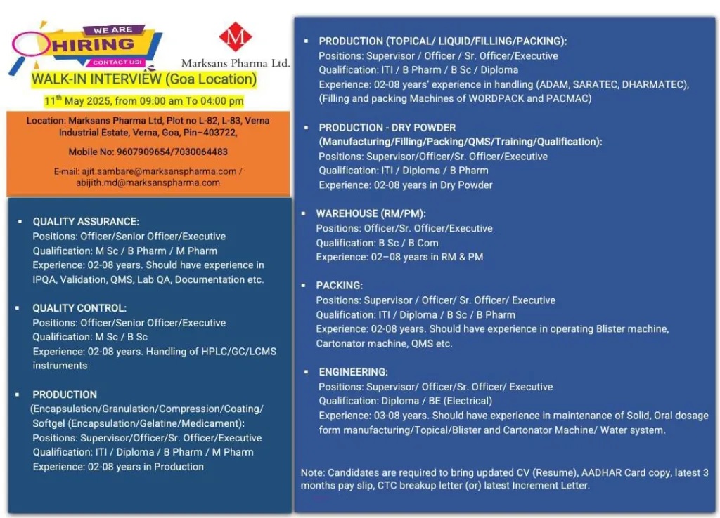 Marksans Pharma-Walk-In Drive for Multiple Opening on 11th May 2025