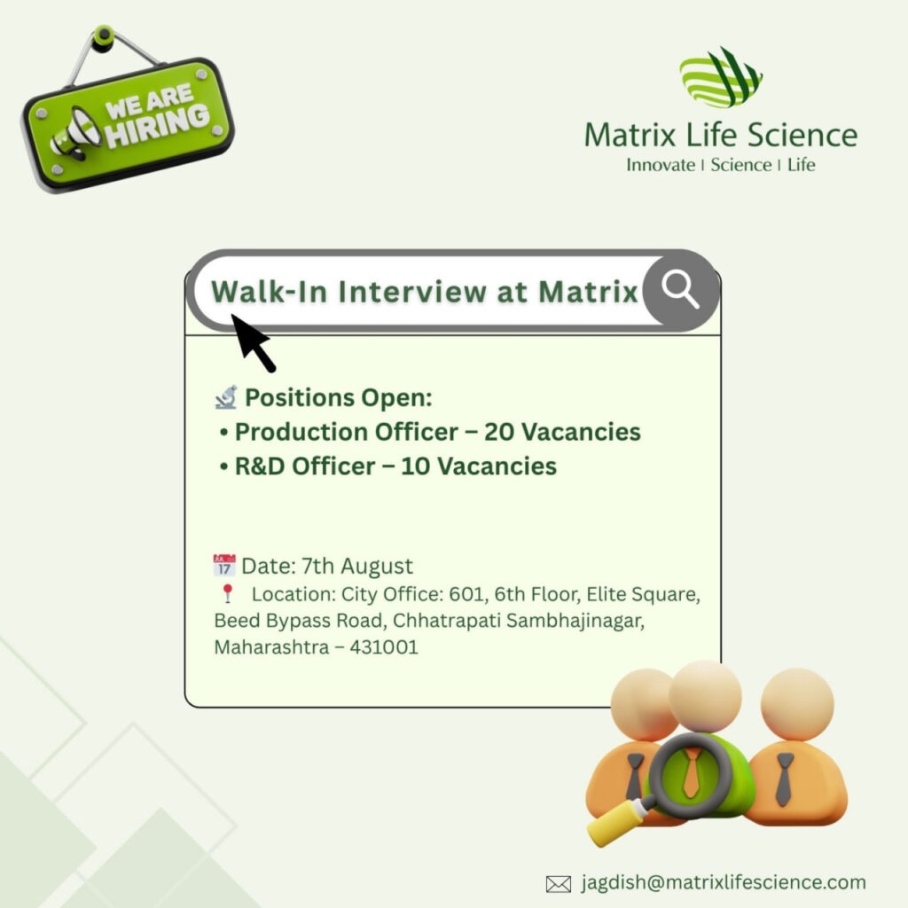 Matrix Life Science-Walk-In Interview Production & R&D Officers on 7th August 2025 Matrix Life Science-Walk-In Interview Production & R&D Officers on 7th August 2025 Post Views: 365 Job Category: Pharma Job Type: Full Time Job Location: Chhatrapati Sambhajinagar Apply for this position Full Name *Email *Phone *Cover Letter *Upload CV/Resume *Allowed Type(s): .pdf, .doc, .docxBy using this form you agree with the storage and handling of your data by this website. *