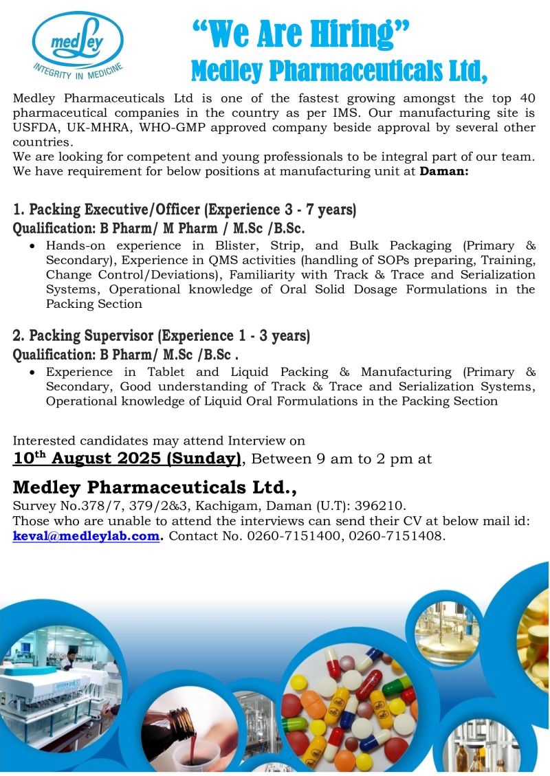 at Medley Pharmaceuticals Ltd., Survey No.378/7, 379/2&3, Kachigam, Daman (U.T): 396210.