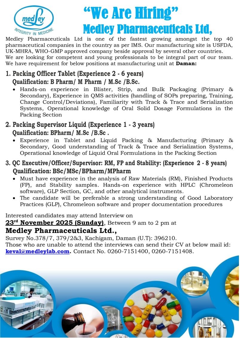 Qualification : B.Pharm / M.Pharm / M.Sc /B.Sc.