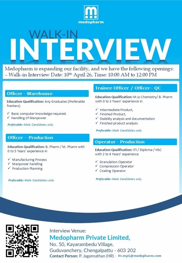 Medopharm- Walk-In Interview For Production, QC & Warehouse on10th April 2026 Medopharm- Walk-In Interview For Production, QC & Warehouse on10th April 2026 Post Views: 6 Job Category: Pharma Job Type: Full Time Job Location: Guduvanchery Apply for this position Full Name *Email *Phone *Cover Letter *Upload CV/Resume *Allowed Type(s): .pdf, .doc, .docxBy using this form you agree with the storage and handling of your data by this website. *