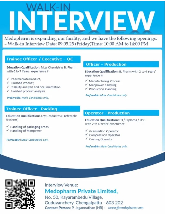 Medopharm is expanding our facility, and we have the following openings: Walk-in Interview Date: 09.05.25 (Friday) Time: 10:00 AM to 14:00 PM.