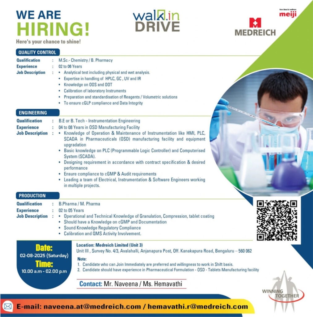 Medreich- Walk-In Drive for QC, Engineering, & Production on 2nd August 2025 @ Bengaluru