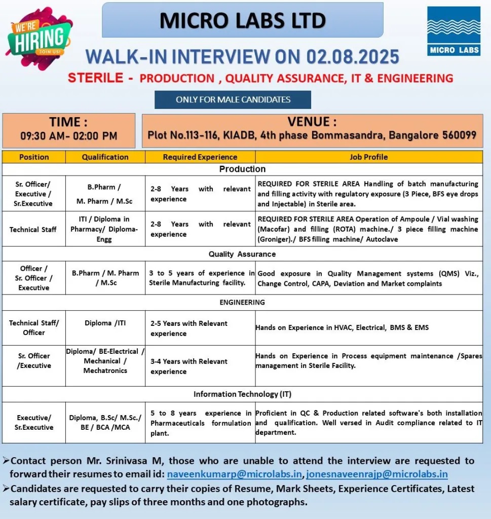 📍 Venue:Micro Labs Ltd., Plot No. 113-116, KIADB, 4th Phase, Bommasandra, Bangalore – 560099