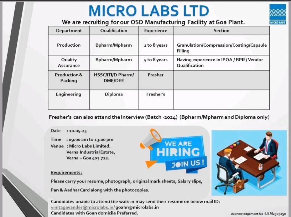 Micro Labs Ltd- Walk-in Interview for Production, QA, Packing & Engineering on May 10, 2025