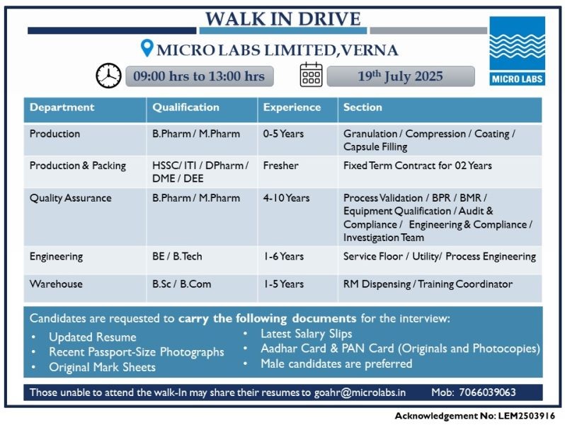 Location : Micro Labs Limited, Verna Industrial Estate, Verna, Goa, 403718