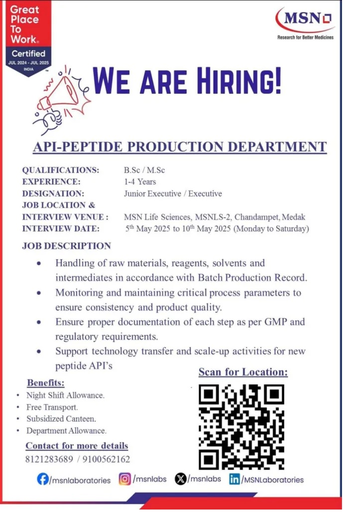 MSN Laboratories-Walk-In Drive API Peptide Production Dept on May 5th to 10th 2025 MSN Laboratories-Walk-In Drive API Peptide Production Dept on May 5th to 10th 2025 Post Views: 759 Job Category: Pharma Job Type: Full Time Job Location: Hyderabad Apply for this position Full Name *Email *Phone *Cover Letter *Upload CV/Resume *Allowed Type(s): .pdf, .doc, .docxBy using this form you agree with the storage and handling of your data by this website. *