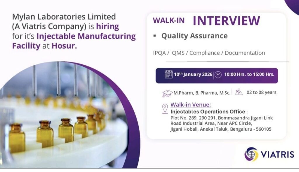 Mylan Injectables- Walk-In Interview for Quality Assurance on January 10th, 2026 @ Bengaluru