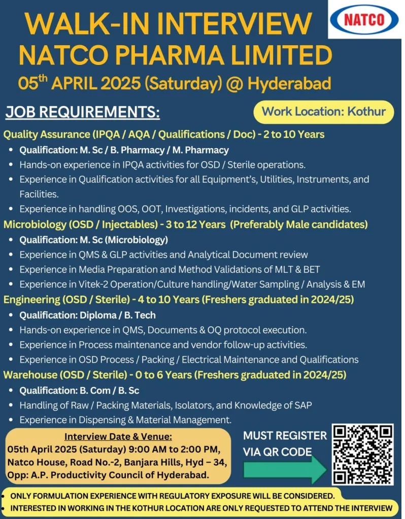 WALK-IN INTERVIEW NATCO PHARMA LIMITED 05th APRIL 2025 (Saturday) @ Hyderabad