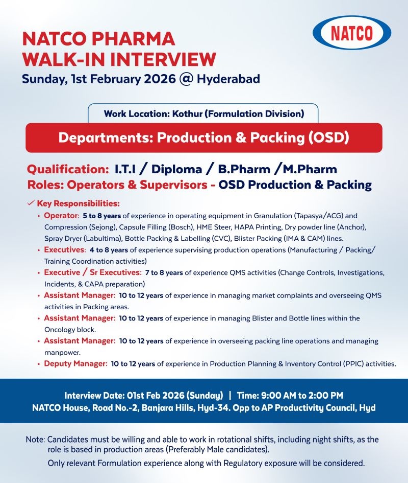 NATCO Pharma- Walk-In Interview for Production & Packing on , 01 February 2026