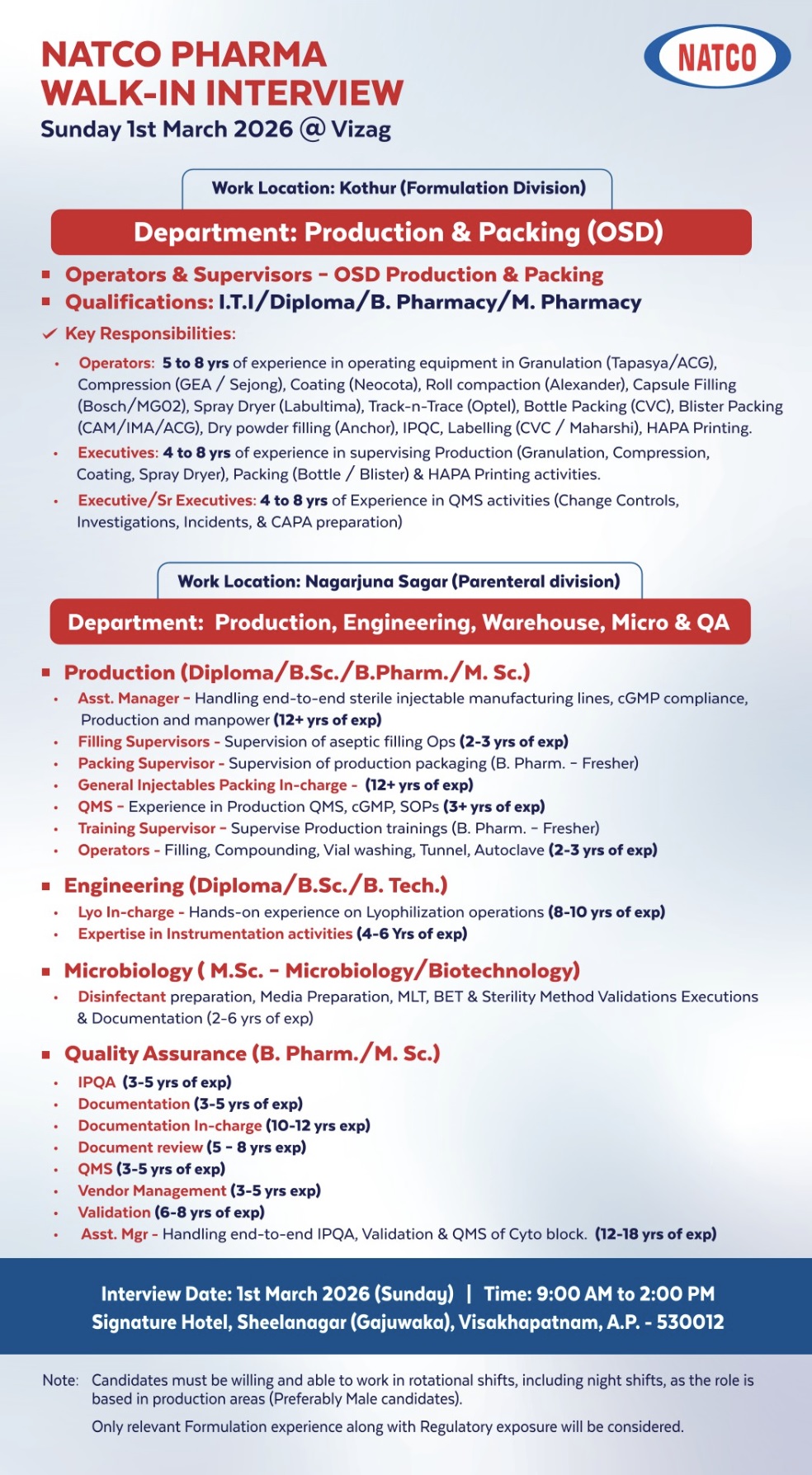 Natco Pharma- Walk-In Interview for Production & Packing (OSD)on 1st March 2026 Natco Pharma- Walk-In Interview for Production & Packing (OSD)on 1st March 2026 Post Views: 14 Job Category: Pharma Job Type: Full Time Job Location: Kothur (Formulation Division) Nagarjuna Sagar Apply for this position Full Name *Email *Phone *Cover Letter *Upload CV/Resume *Allowed Type(s): .pdf, .doc, .docxBy using this form you agree with the storage and handling of your data by this website. *