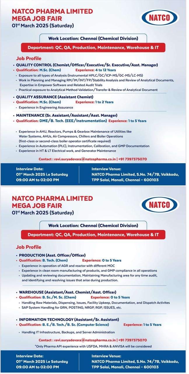 NATCO Pharma – Walk-Ins for QC, QA, Production, Maintenance, Warehouse, IT Departments on 1st Mar’ 2025