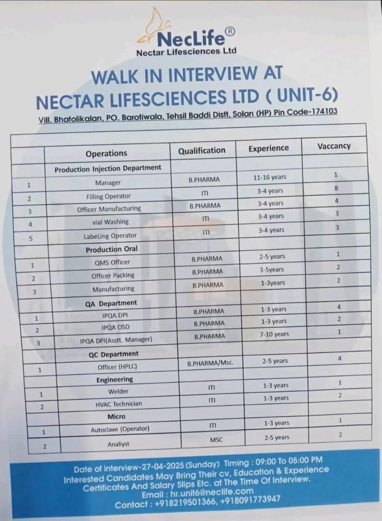 Nectar Lifesciences Ltd- Walk-In Interviews for Production, QA, QC, Engineering & Micro on 27th April 2025@Baddi Nectar Lifesciences Ltd- Walk-In Interviews for Production, QA, QC, Engineering & Micro on 27th April 2025@Baddi Post Views: 1,194 Job Category: Pharma Job Type: Full Time Job Location: Baddi Apply for this position Full Name *Email *Phone *Cover Letter *Upload CV/Resume *Allowed Type(s): .pdf, .doc, .docxBy using this form you agree with the storage and handling of your data by this website. *
