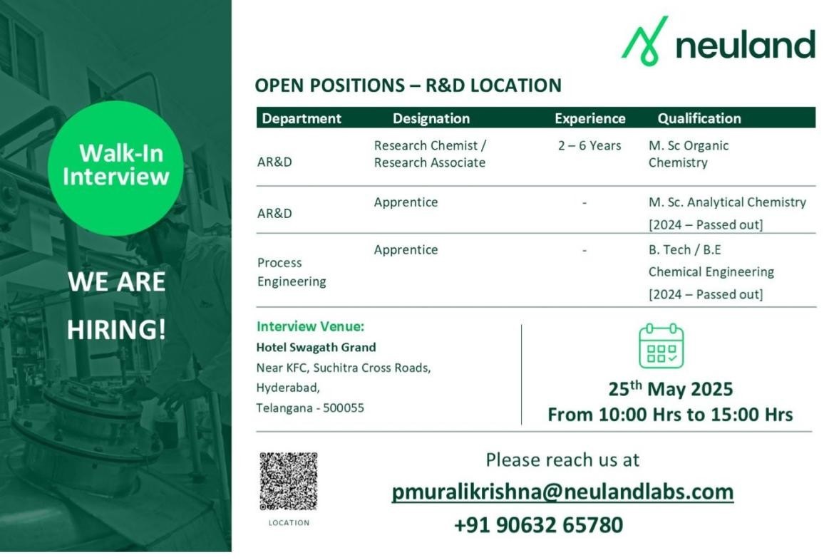 Neuland Laboratories -Walk-in Interview On 25th May 2025 Neuland Laboratories -Walk-in Interview On 25th May 2025 Post Views: 872 Job Category: Pharma Job Type: Full Time Job Location: Hyderabad Apply for this position Full Name *Email *Phone *Cover Letter *Upload CV/Resume *Allowed Type(s): .pdf, .doc, .docxBy using this form you agree with the storage and handling of your data by this website. *