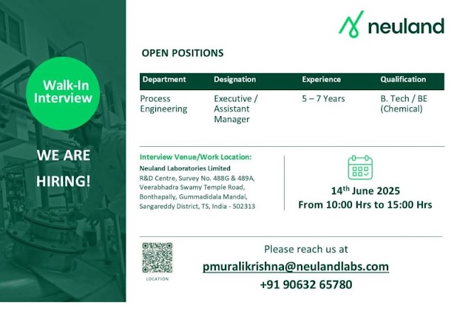 Neuland Laboratories- Walk In Interview For Process Engineering on 14th June 2025