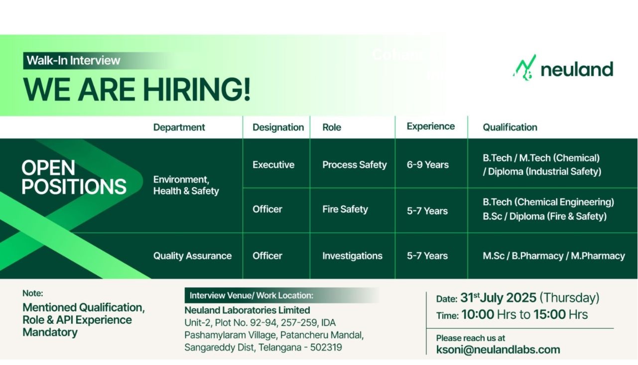 Neuland Laboratories- Walk-In Interview for EHS & QA on 31st July 2025 Neuland Laboratories- Walk-In Interview for EHS & QA on 31st July 2025 Post Views: 339 Job Category: Pharma Job Type: Full Time Job Location: Pashamylaram Sangareddy Apply for this position Full Name *Email *Phone *Cover Letter *Upload CV/Resume *Allowed Type(s): .pdf, .doc, .docxBy using this form you agree with the storage and handling of your data by this website. *