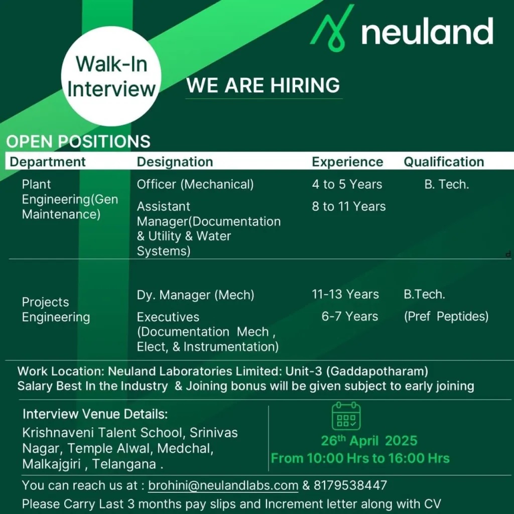 Work Location: Neuland Laboratories Limited: Unit-3 (Gaddapotharam)