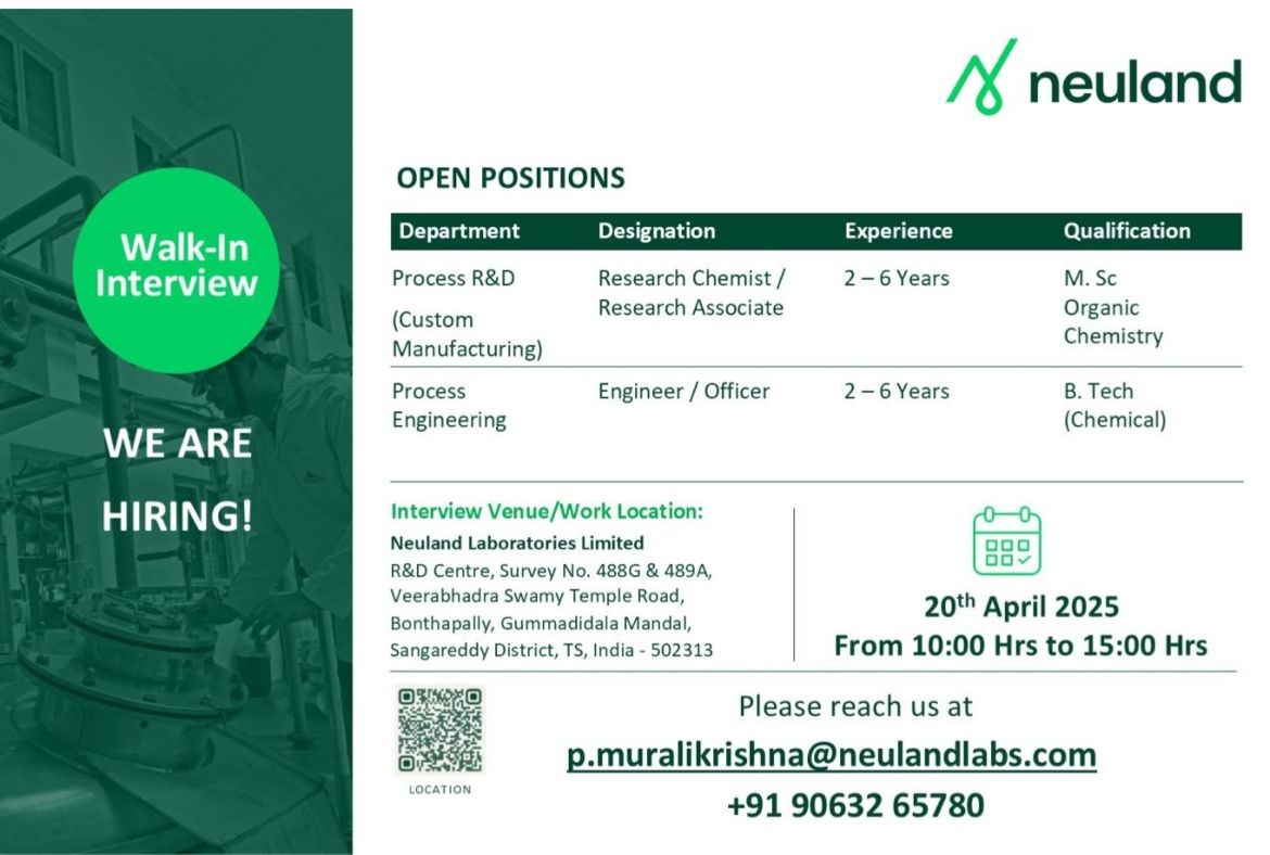 Neuland Pharma- Walk In Interview For Process R&D and Custom Manufacturing on 20th April 2025