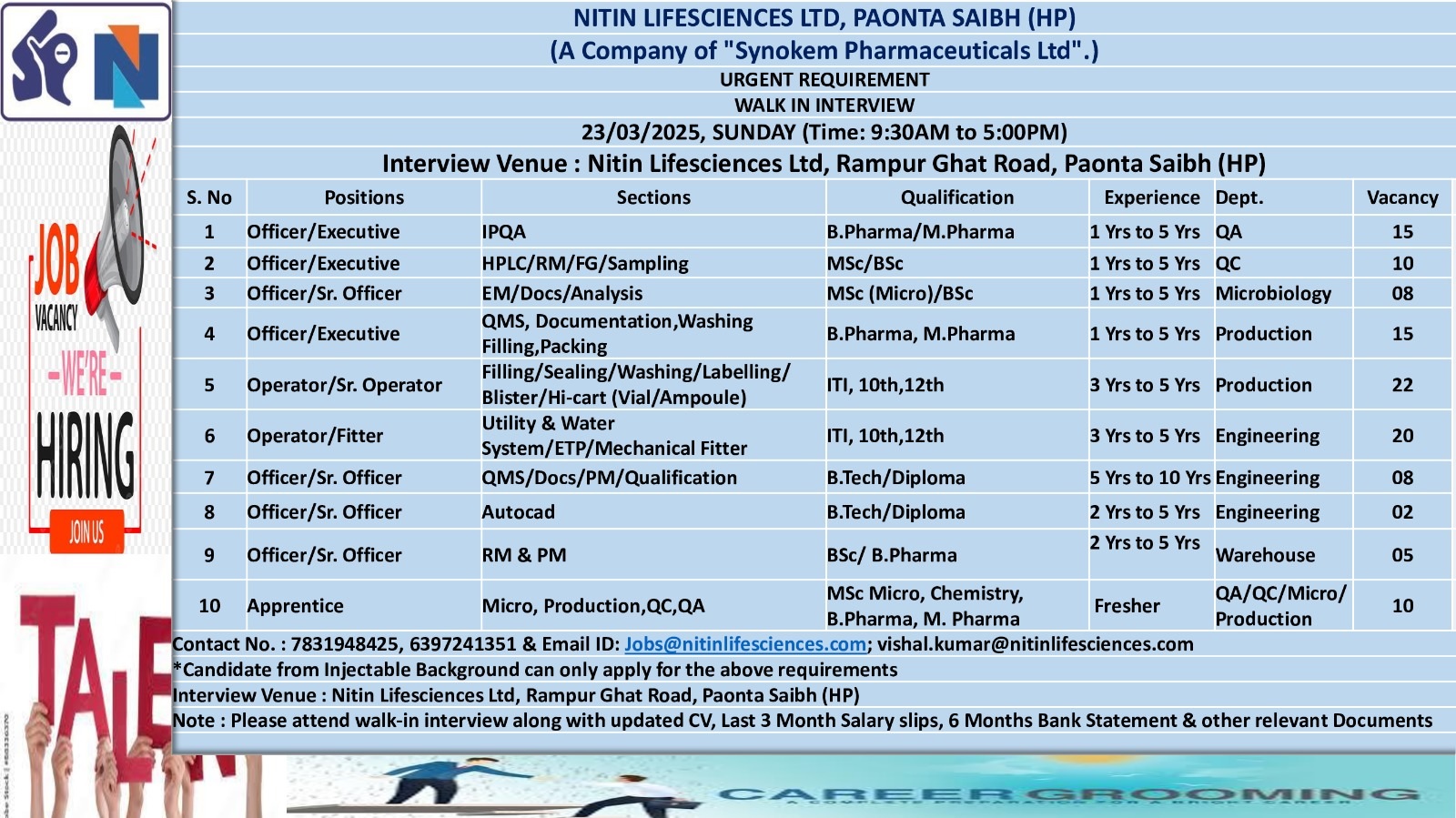Interview Venue : Nitin Lifesciences Ltd, Rampur Ghat Road, Paonta Saibh (HP)