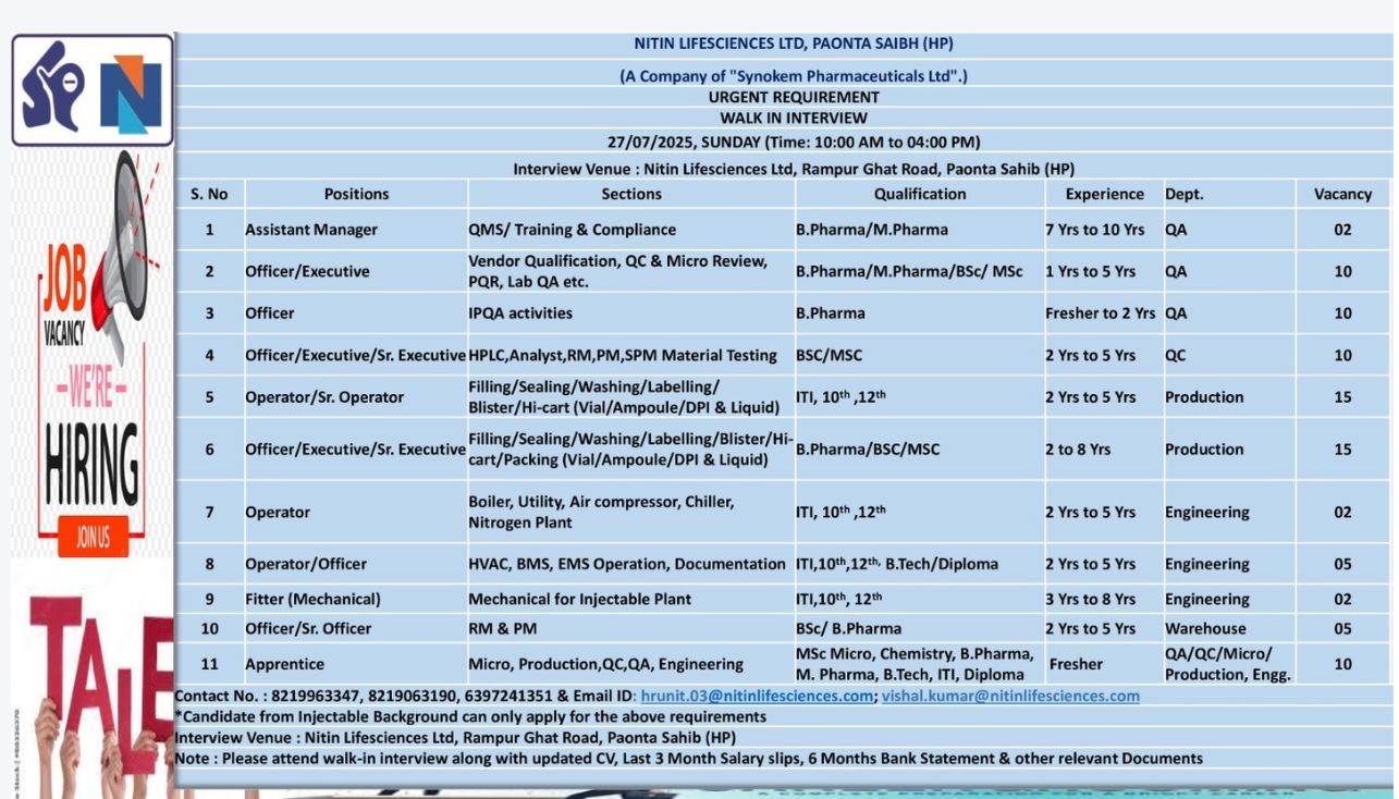 Nitin Lifesciences- Walk-In Interview for Production & QA/QC on July 27, Paonta Sahib,