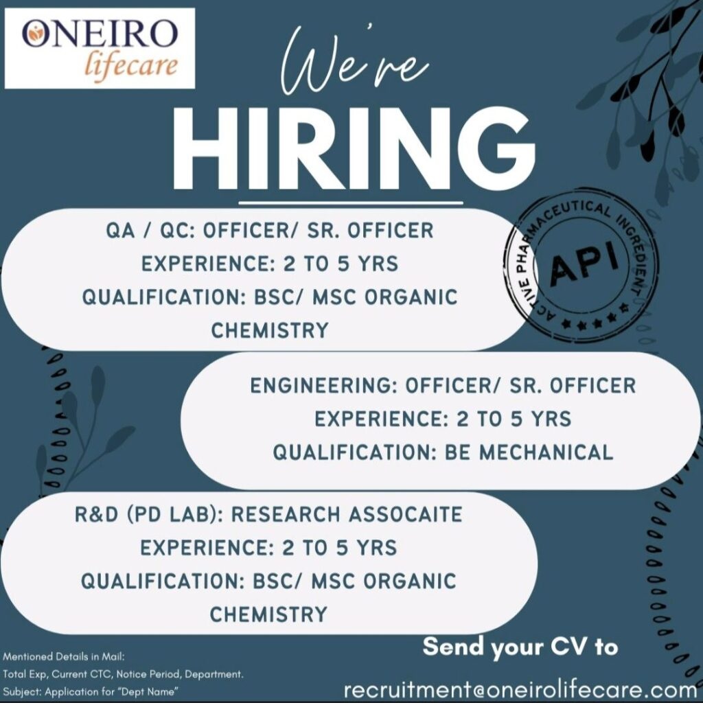 Oneiro Lifecare- Openings for QA, QC, R&D & Engineering Apply Oneiro Lifecare- Openings for QA, QC, R&D & Engineering Apply Post Views: 327 Job Category: Pharma Job Type: Full Time Job Location: Vadodara Apply for this position Full Name *Email *Phone *Cover Letter *Upload CV/Resume *Allowed Type(s): .pdf, .doc, .docxBy using this form you agree with the storage and handling of your data by this website. *