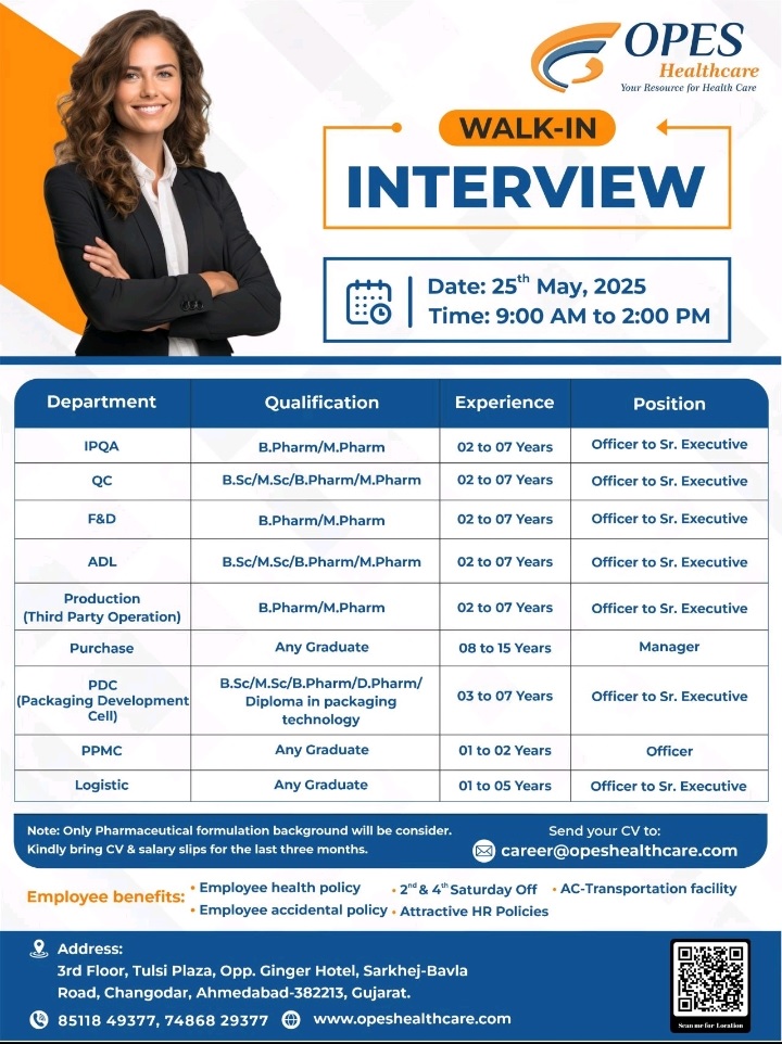 Opes Healthcare- Walk in interview for IPQA, QC, F&D, production, purchase, PPMC, PDC on 25th May 2025 @Ahmedabad