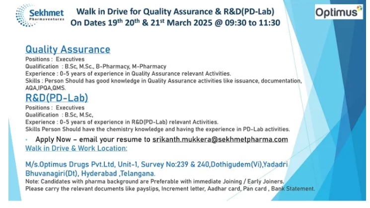 Walk in Drive @ Optimus Drugs Pvt. Ltd for Quality Assurance & R&D (PD-Lab) On Dates 19th, 20th & 21st March 2025 @ 09:30 to 11:30.