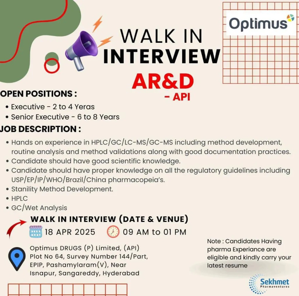 Optimus Pharma-Walk-In Interview for AR&D (API) on 18th April 2025 Optimus Pharma-Walk-In Interview for AR&D (API) on 18th April 2025 Post Views: 1,144 Job Category: Pharma Job Type: Full Time Job Location: Sangareddy Apply for this position Full Name *Email *Phone *Cover Letter *Upload CV/Resume *Allowed Type(s): .pdf, .doc, .docxBy using this form you agree with the storage and handling of your data by this website. *