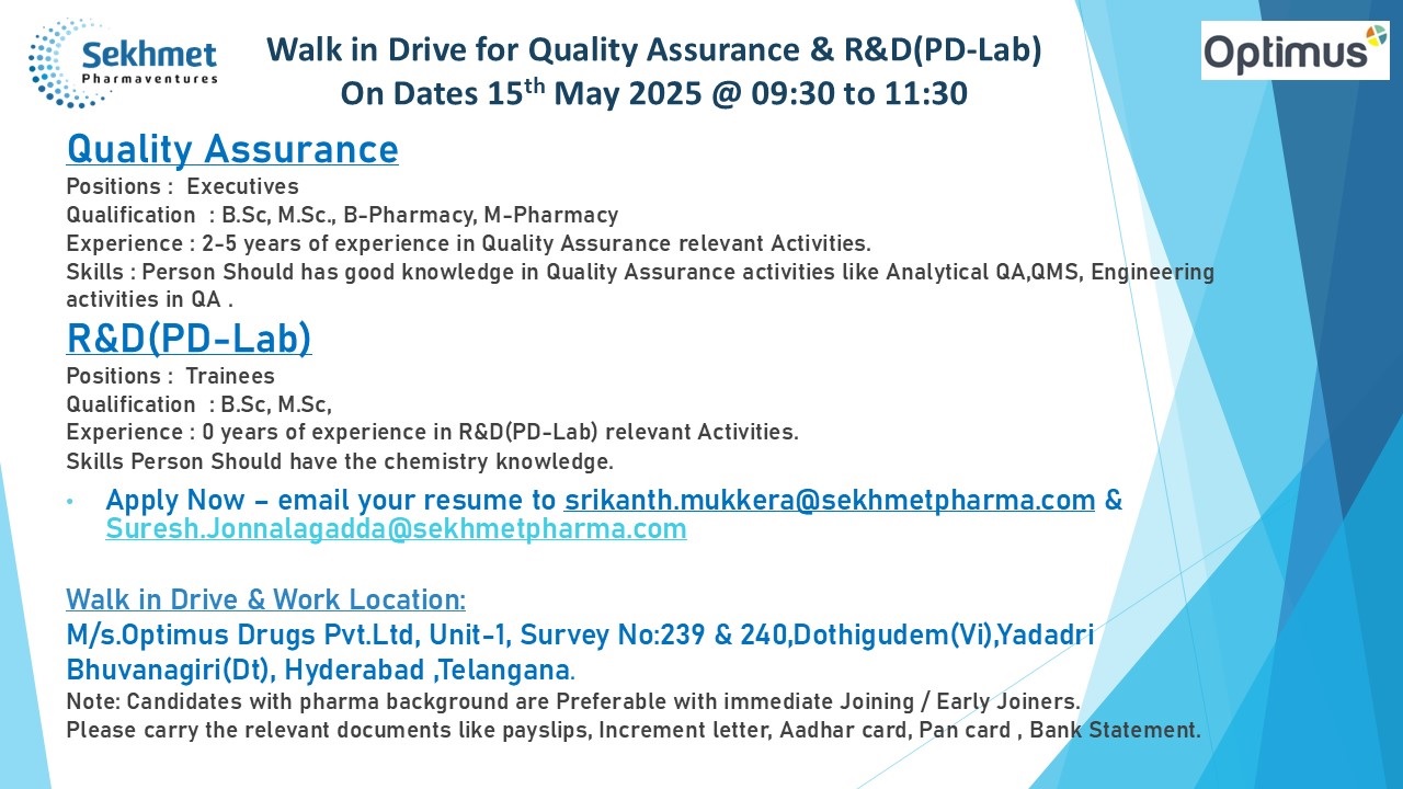 Note: Candidates with pharma background are Preferable with immediate Joining / Early Joiners. Please carry the relevant documents like payslips, Increment letter, Aadhar card, Pan card, Bank Statement.
