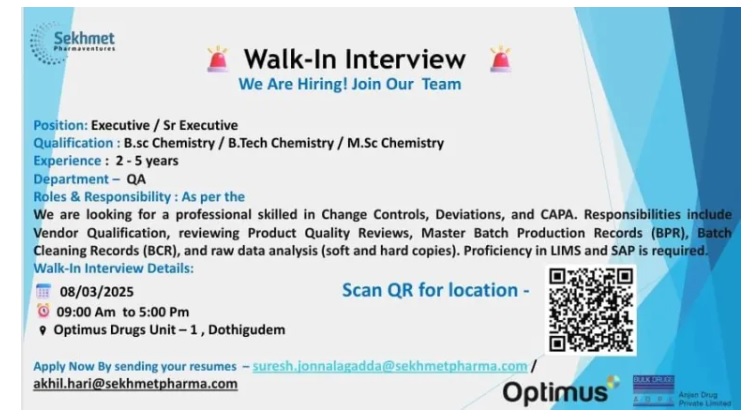 We are looking for a professional skilled in Change Controls, Deviations, and CAPA. Responsibilities include Vendor Qualification, reviewing Product Quality Reviews, Master Batch Production Records (BPR), Batch Cleaning Records (BCR), and raw data analysis (soft and hard copies). Proficiency in LIMS and SAP is required. Walk-In Interview Details: